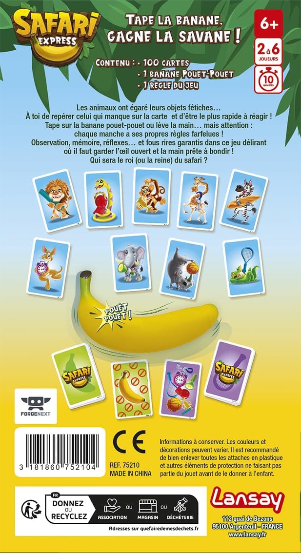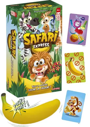 Prêt à vivre une aventure rapide et pleine de surprises au cœur de la savane ? Bienvenue dans Safari Express ! Ici, chaque animal a son objet fétiche : une casquette stylée, une lampe torche ou même une raquette de tennis. Mais attention… dans ce safari, les objets se perdent mystérieusement ! Sur chaque carte "Objet", il manque toujours un accessoire. À toi d’être le plus rapide pour le repérer et deviner quel animal l’a égaré ! Le premier joueur à trouver l’objet manquant et à crier l’animal correspondant remporte la manche. Aiguise ton œil, teste tes réflexes, et prouve que tu es le roi (ou la reine) du Safari Express ! Qui sera le plus vif pour relever ce défi sauvage ?